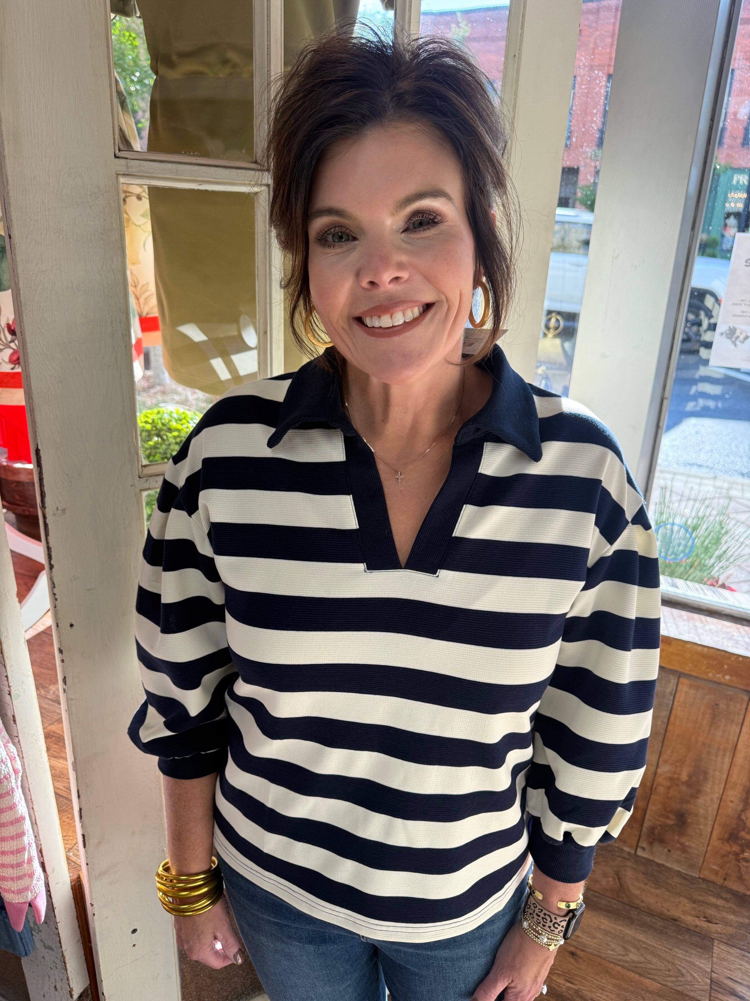 Experience comfort and style with the Harbor & Hue Top. This striped ottoman pullover features a striking contrast collar and a deep V neckline in navy, offering a flattering fit that’s easy to wear. Perfect for layering or as a standout piece on its own, it combines casual charm with thoughtful design to support your everyday wardrobe needs.