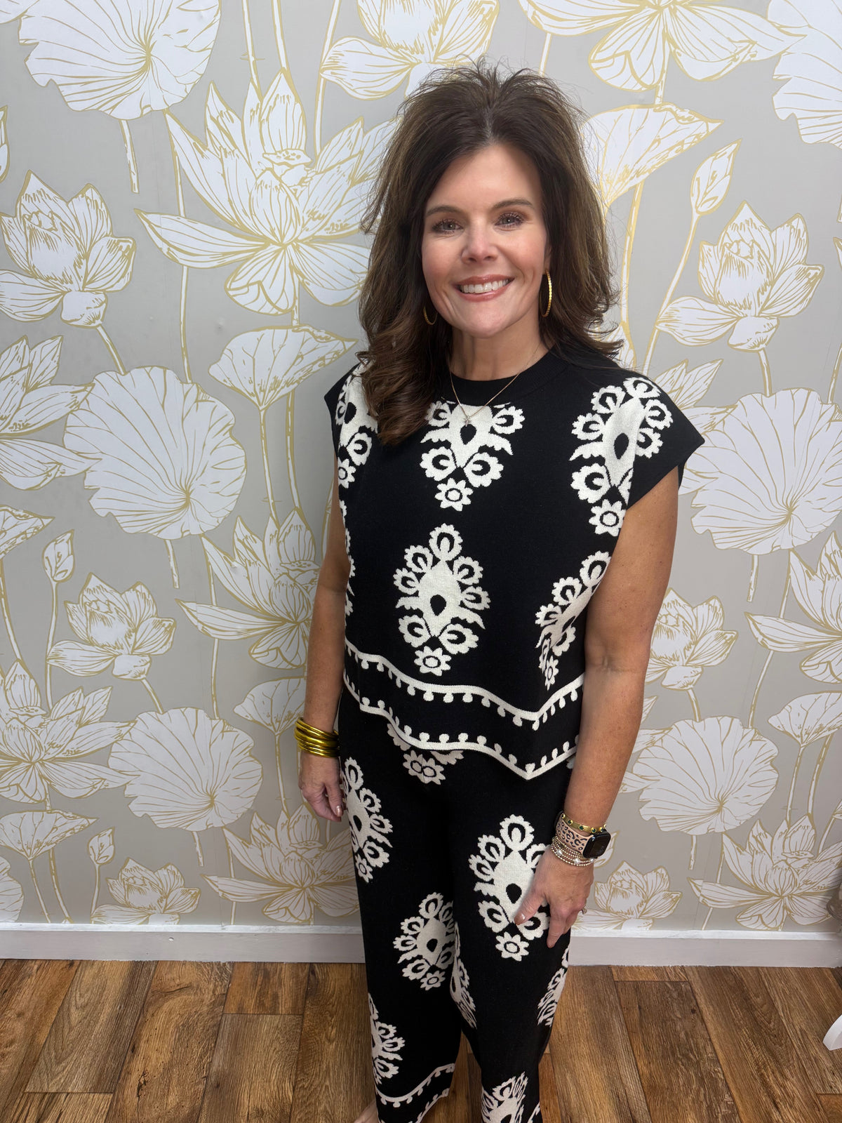 The DaMask Set features a damask pattern sweater knit muscle tee and matching pull-on pants, crafted from medium-weight, non-sheer knit fabric for comfortable wear. Both pieces are unlined for a breathable fit, offering a stylish yet cozy outfit perfect for everyday wear or casual occasions. This coordinated set provides effortless style with a flattering silhouette and the versatility you’ll appreciate.
