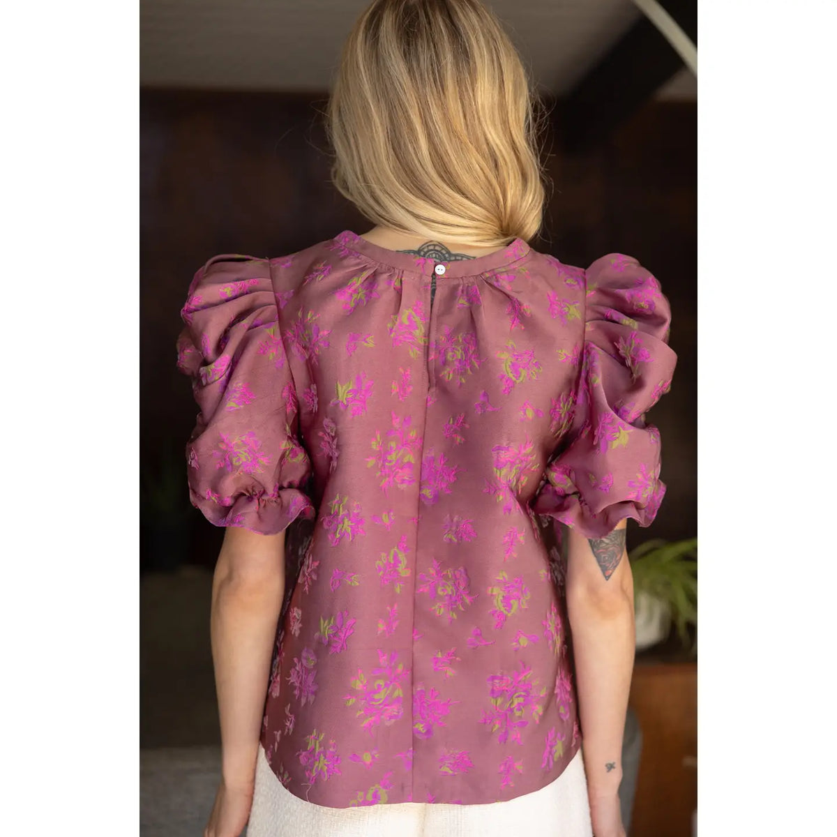 This Laura Floral Top is perfect for any occasion. With its round neckline and ruched short sleeves, it offers a comfortable and stylish fit. The back neck button and elastic loop closure add a unique touch, while the floral jaquard top adds a touch of elegance. You'll love the versatility and beauty of this top.