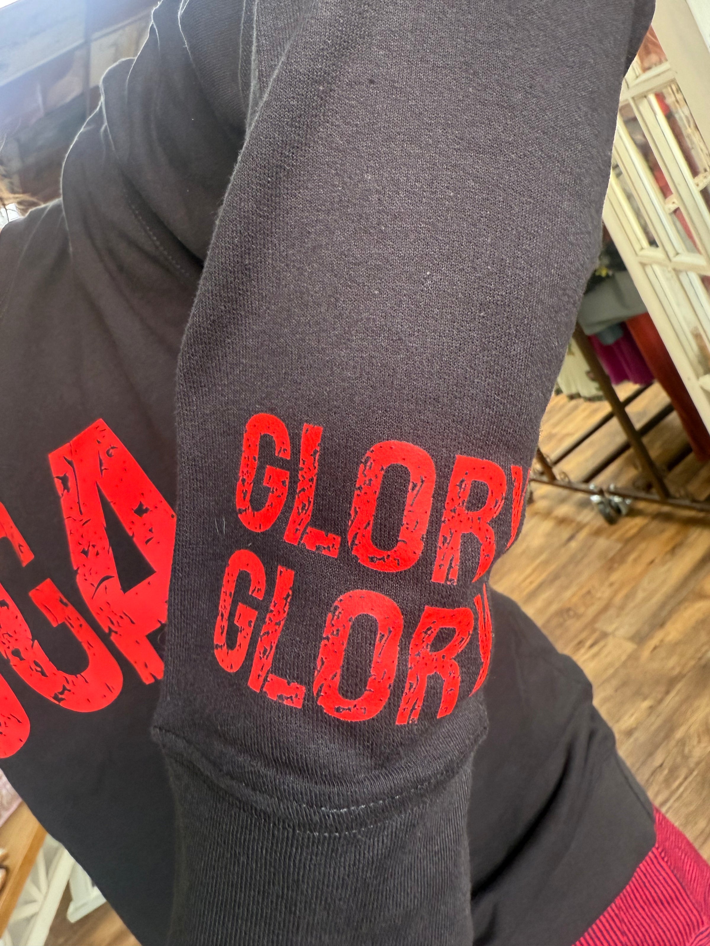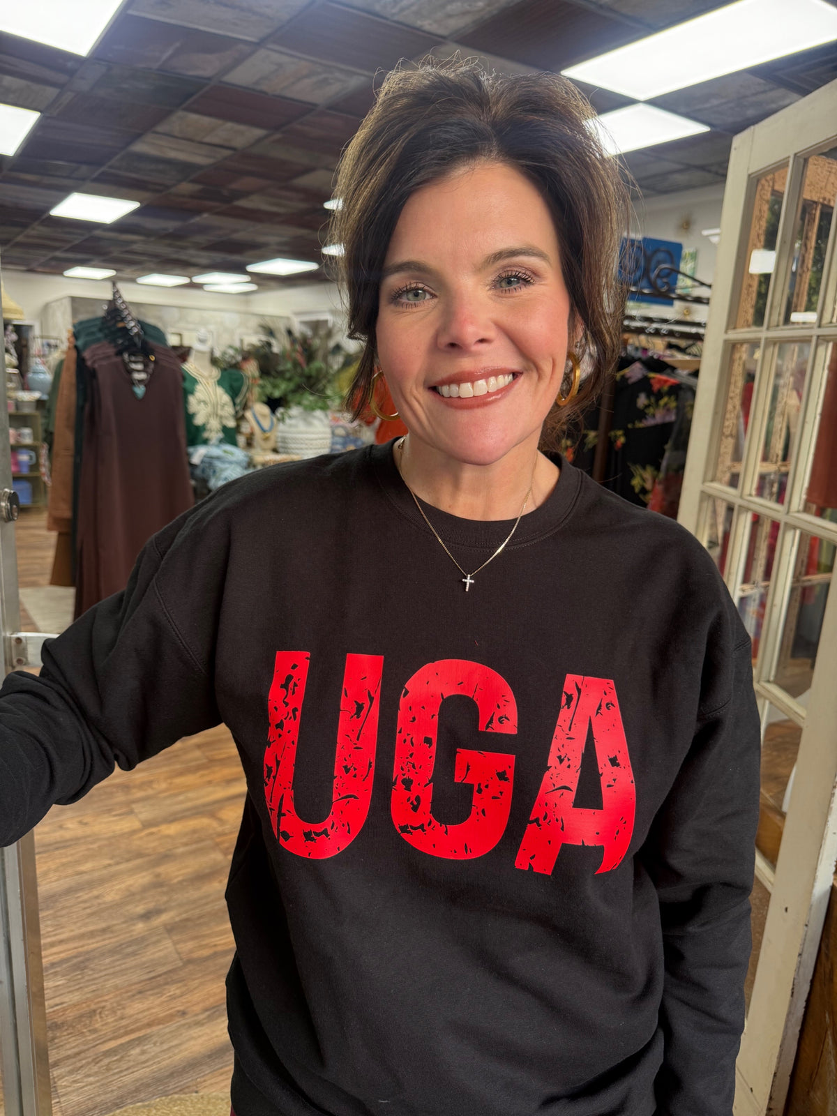 Stay warm and show your school pride with our UGA sweatshirt. Made with a sleek black design, this sweatshirt showcases your love for UGA in style. Perfect for chilly days on campus or game day, this sweatshirt is a must-have for any true Bulldog fan.