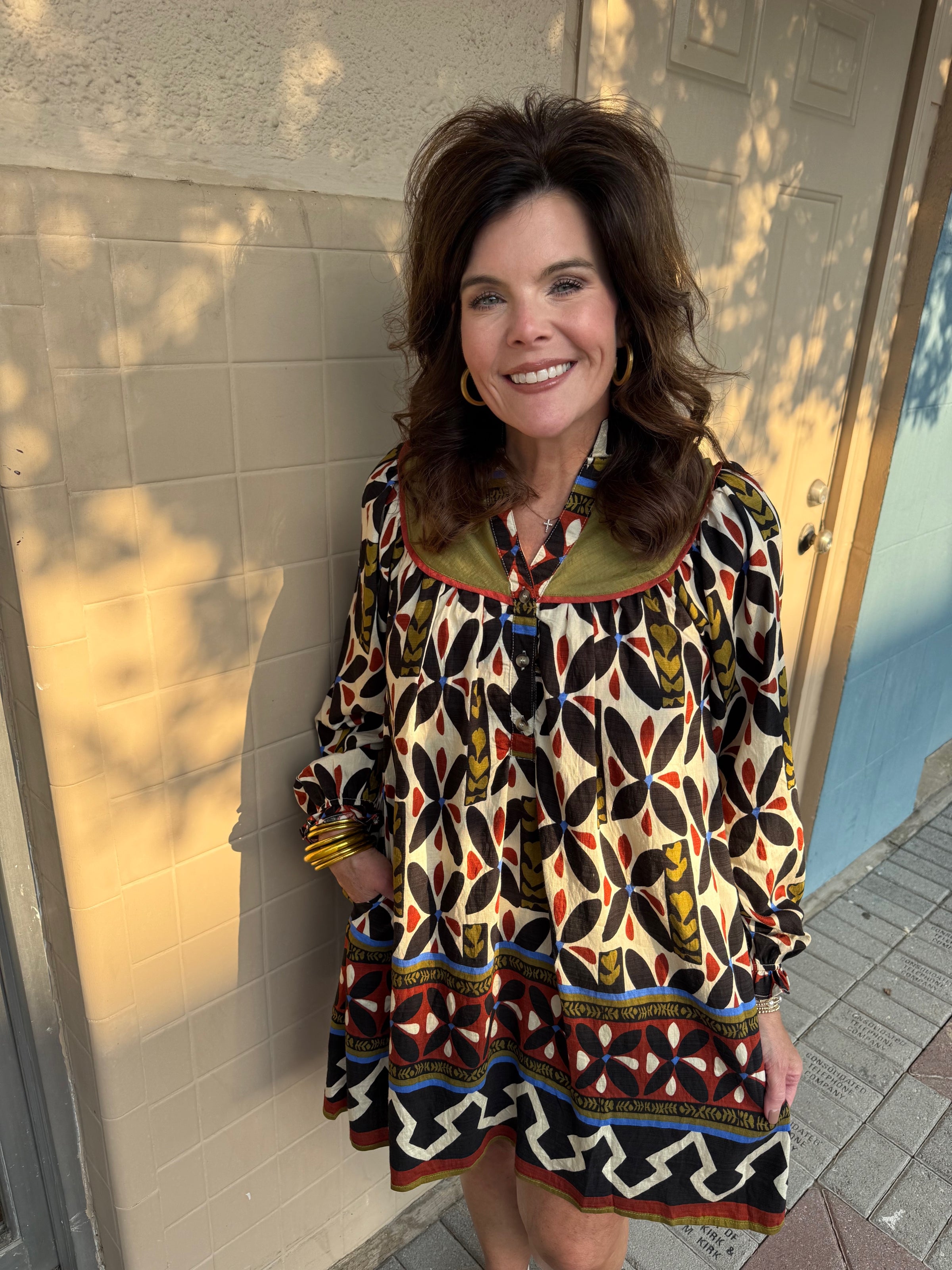 This black mini dress features a striking geometric print and a flattering V-neck with button details. Long sleeves add elegance, while the fully lined design ensures comfort and quality. Perfect for making a stylish statement with ease.
