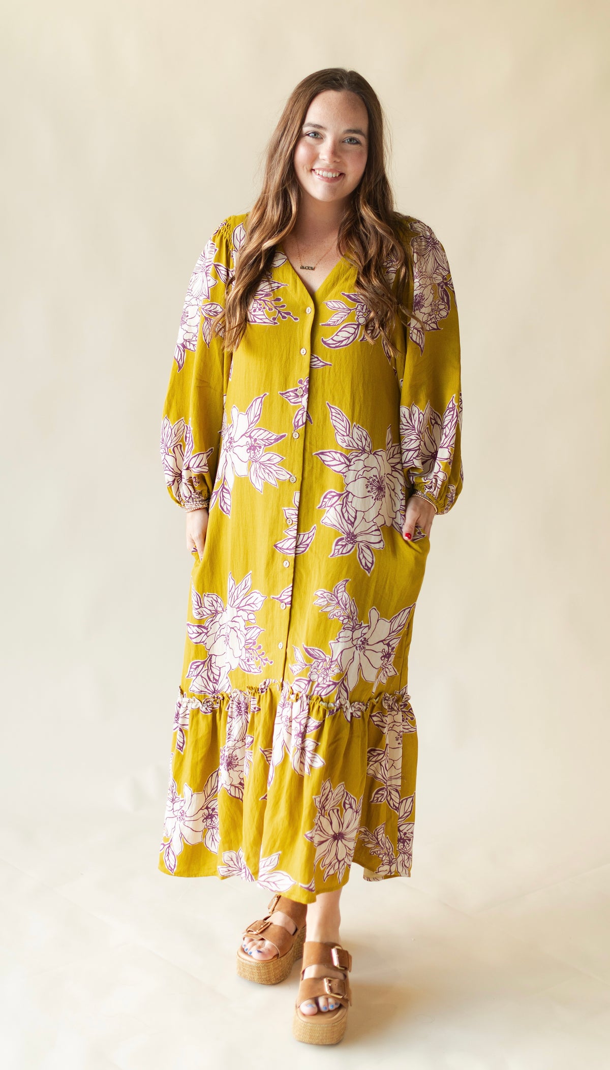 The Mustard Maxi Dress offers a comfortable, relaxed fit perfect for any occasion. Crafted from lightweight rayon nylon, it features smocked shoulders and 3/4 sleeves with cinched ends for subtle detail. The V-neck with button-down closure and floral print design add timeless charm, while the ruffled bottom brings a gentle, feminine touch to the silhouette. This dress balances style and ease, making it a versatile addition to your wardrobe.
