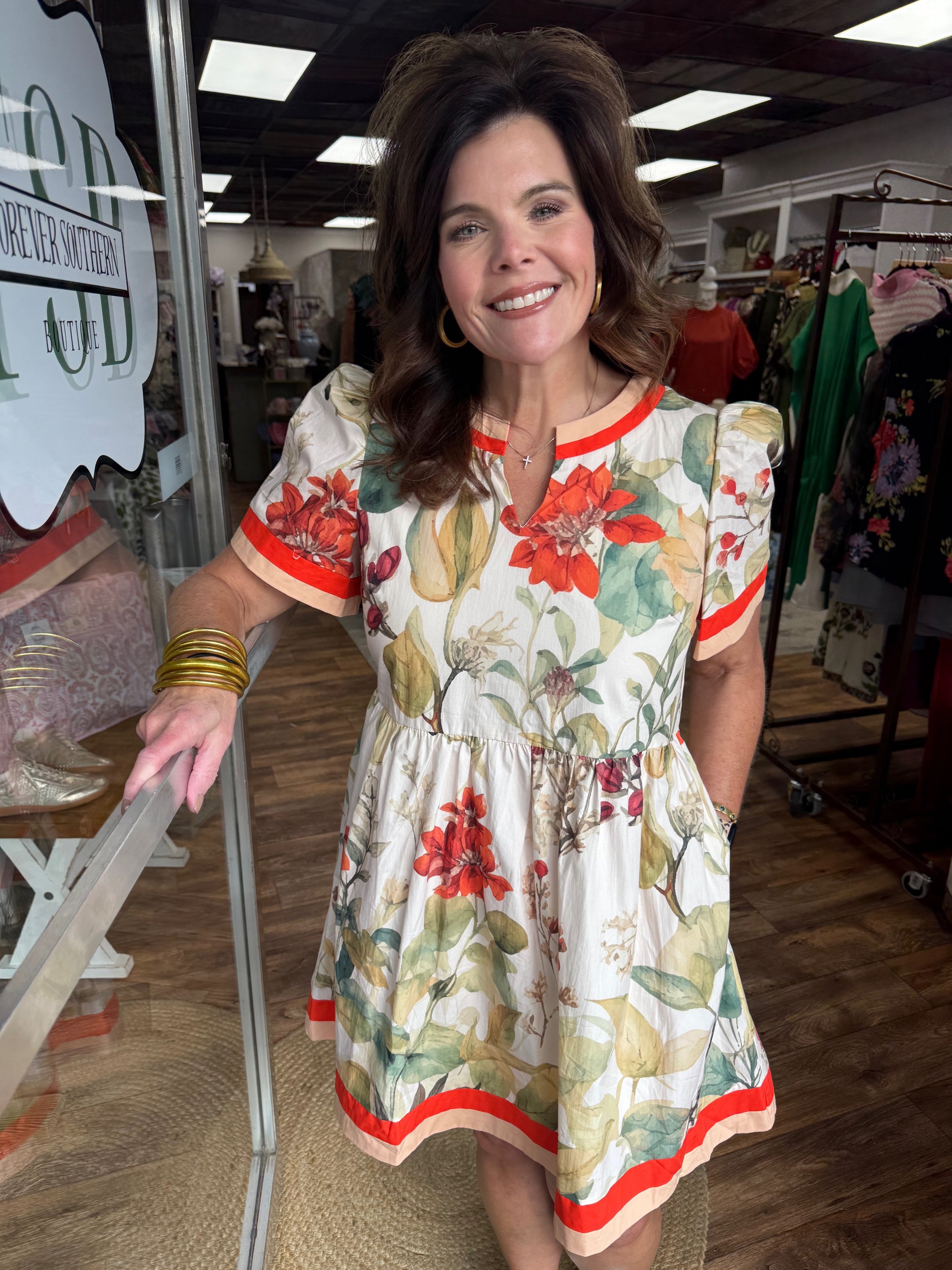 Embrace effortless charm with this floral print babydoll dress, designed to flatter with its high empire waistline and flowing flared skirt. Soft puff sleeves and a notched neckline add a delicate, feminine touch, while the vibrant contrast trim brings playful brightness to your fall wardrobe. This dress offers both comfort and style, perfect for embracing the season with confidence.