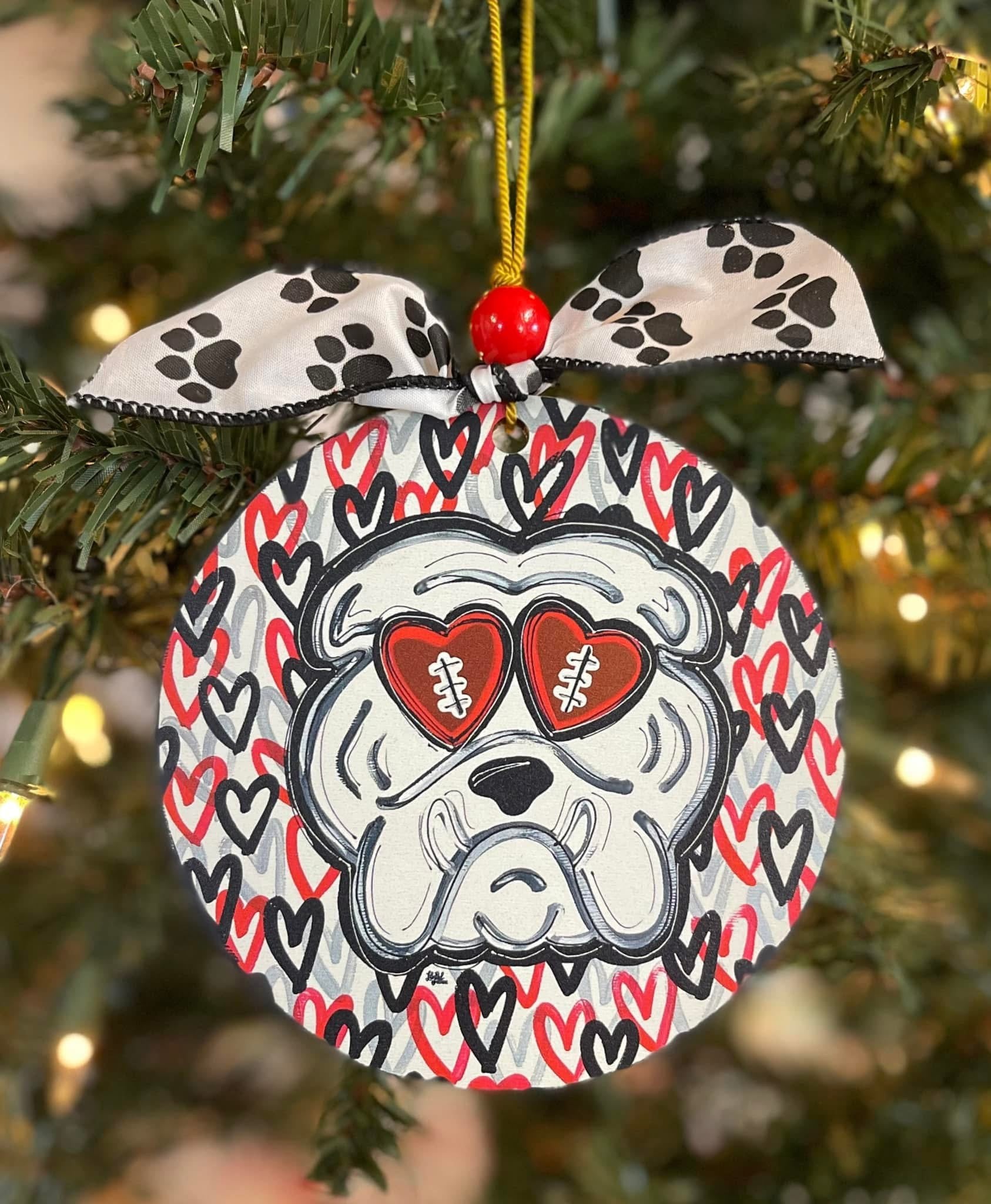 Celebrate your Bulldog pride year-round with this charming Georgia Bulldog ornament. Perfect for fans who bleed red and black, this festive piece brings school spirit to your tree, wreath, or holiday décor. Whether you're decorating your home or giving a gift to a fellow Georgia supporter, this ornament captures the heart of Bulldog Nation. A timeless keepsake that honors your love for the University of Georgia.