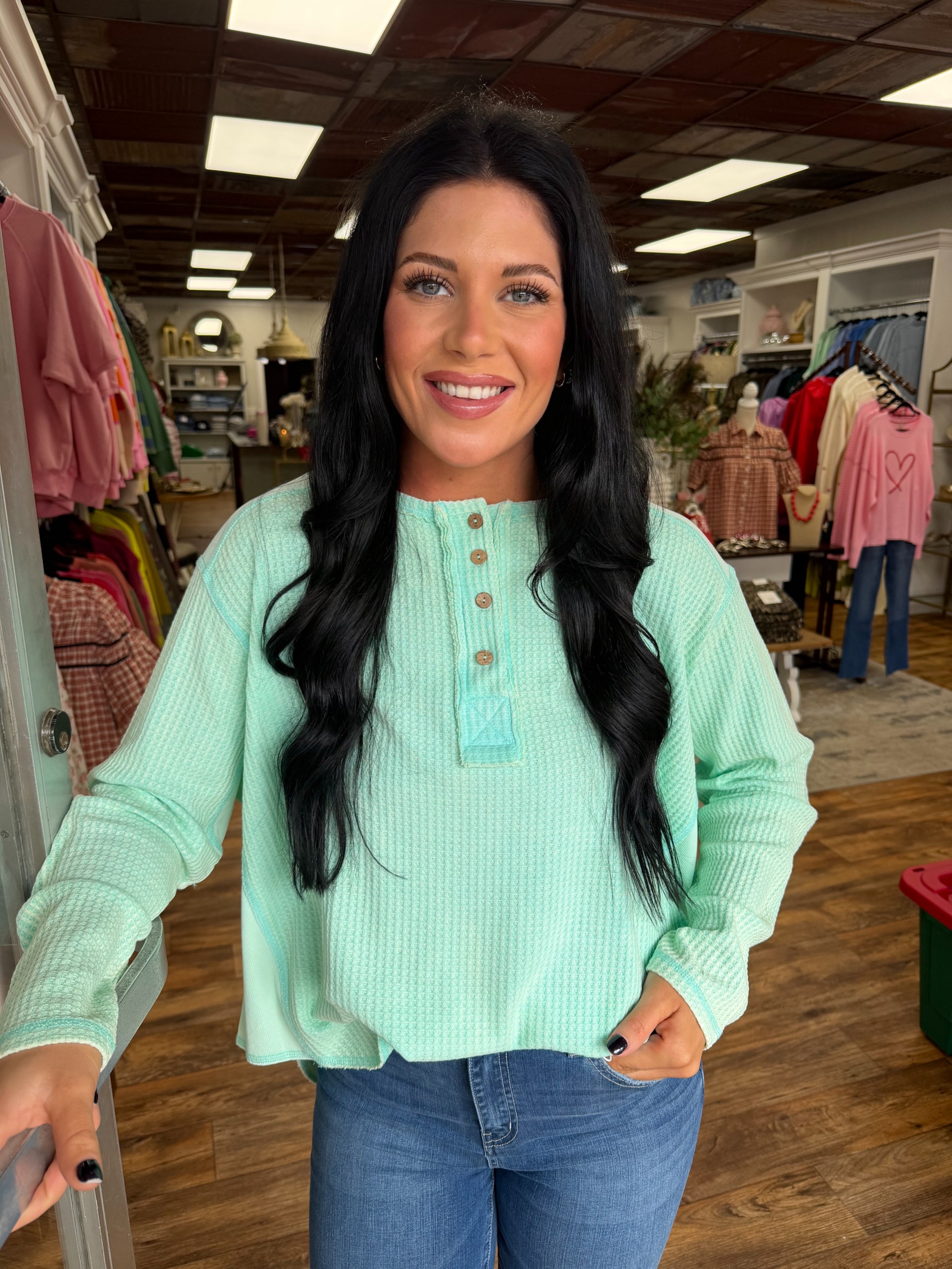 Elevate your everyday wardrobe with The Mint Textured Top, a versatile long sleeve button-up designed to work as hard as you do. The subtle textured fabric adds visual interest and dimension, while the classic button front makes it easy to layer or wear solo. Whether you're heading to the office, running errands, or meeting friends for coffee, this piece adapts beautifully to any occasion. The soft, breathable material keeps you comfortable throughout the day, and the timeless silhouette ensures you'll reach for it season after season. A wardrobe essential that supports your style journey, no matter where life takes you.