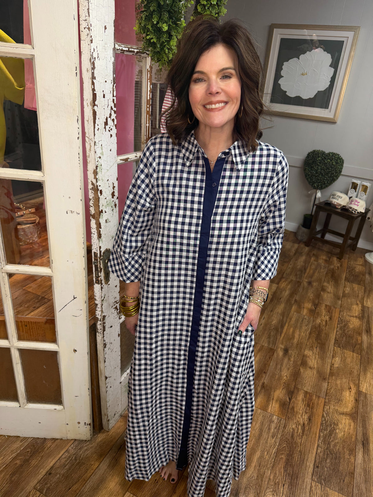 The Gingham Maxi brings effortless charm to your everyday wardrobe. This classic button-down dress features a timeless gingham pattern and three-quarter sleeves that work beautifully through every season. The maxi silhouette offers comfortable coverage while maintaining a polished, put-together look—perfect for casual outings, weekend gatherings, or dressed-up occasions. Versatile and flattering, it's a wardrobe staple you'll reach for again and again.