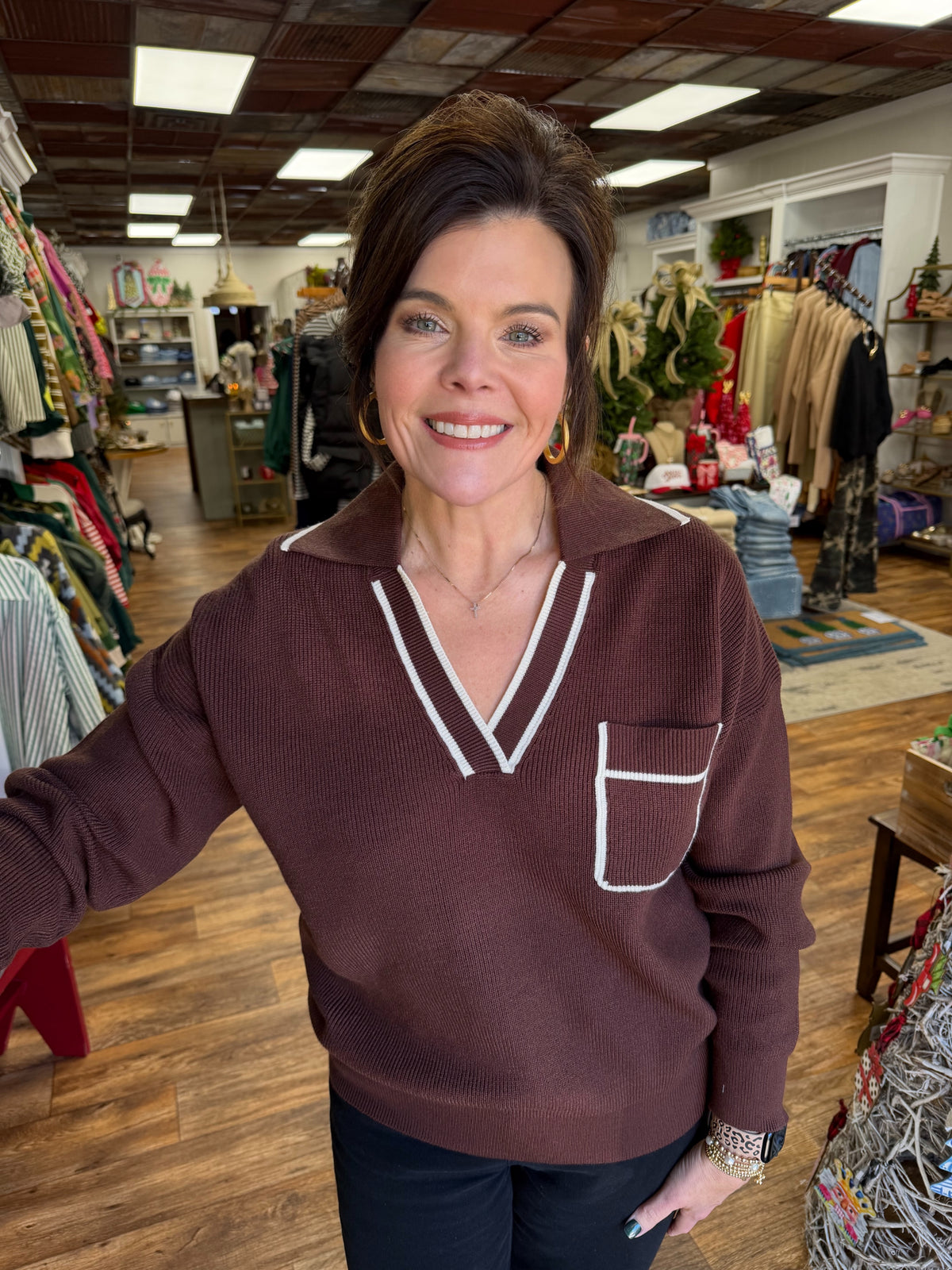 The Karissa Sweater brings effortless elegance to your everyday wardrobe. This classic v-neck design features a refined ivory trim detail that adds a touch of sophistication to any outfit. Perfect for layering or wearing solo, it's the versatile piece you'll reach for season after season. Whether you're dressing up for brunch or keeping it casual, this sweater delivers comfort without compromising on style.